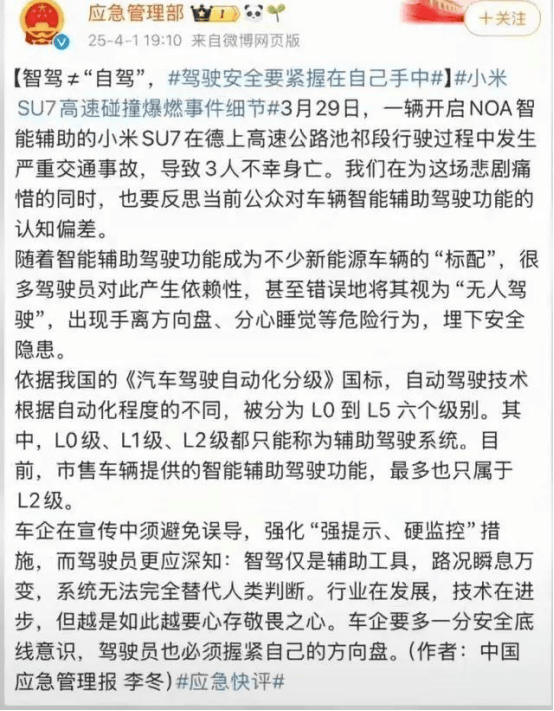 第三种环境,利用智驾系统,当事人未接管车辆操做,能否属于酒后驾驶,能否形成酒驾/醉驾行为。当前新的科技手段屡见不鲜,我国相关的政策也正在取时俱进,2022年3月1日起实施的国度尺度GB/T40429-2021《汽车驾驶从动化分级》中,也将驾驶从动化分为五级,虽然名称略有差别,但焦点意义分歧:0-2级均为驾驶辅帮阶段,即“人机共驾”模式,驾驶员仍为驾驶从体,系统仅起到辅帮感化。值得留意的是,当前车企所能实现的“智驾”还达不到无人驾驶平安级别,距离L5级的“完全从动”另有较大差距。2025年4月1日,国度应急办理部就3月29日小米SU7严沉变乱发文称,根据我国的《汽车驾驶从动化分级》国标,从动驾驶手艺按照从动化程度的分歧,被分为 L0 到 L5 六个级别。此中,L0级、L1级、L2级都只能称为辅帮驾驶系统。目前,市售车辆供给的智能辅帮驾驶功能,最多也只属于L2级。