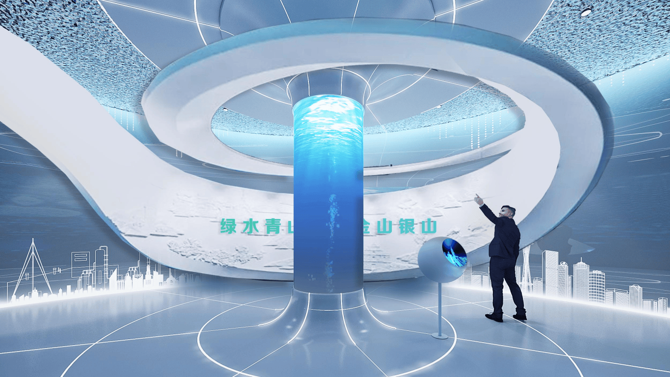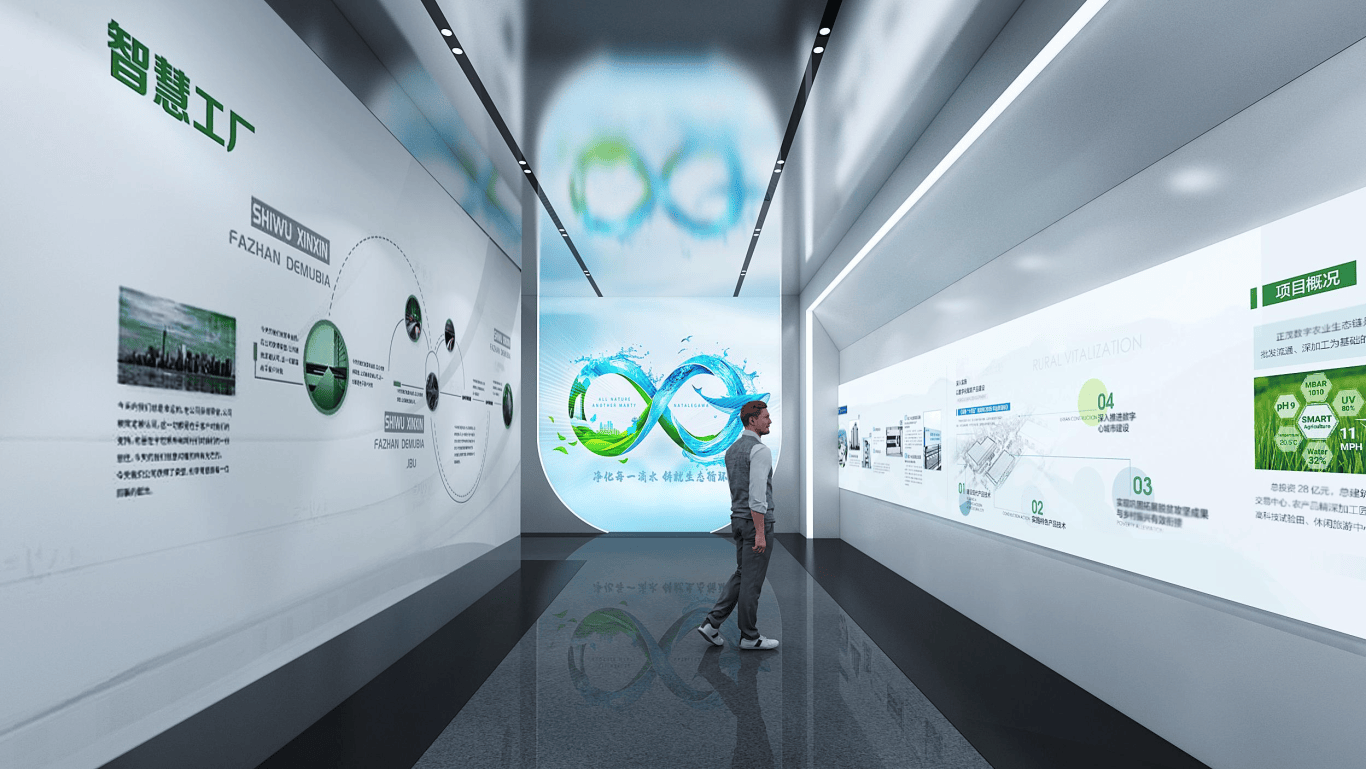 序厅以 “轮回净化柱” 为焦点安拆,柱子包裹动感灯箱,模仿污水净化反映器,参不雅者可曲旁不雅到 “河水由浊变清” 的全过程,活泼注释企业 “净化每一滴水,铸就生态轮回” 的初心。
