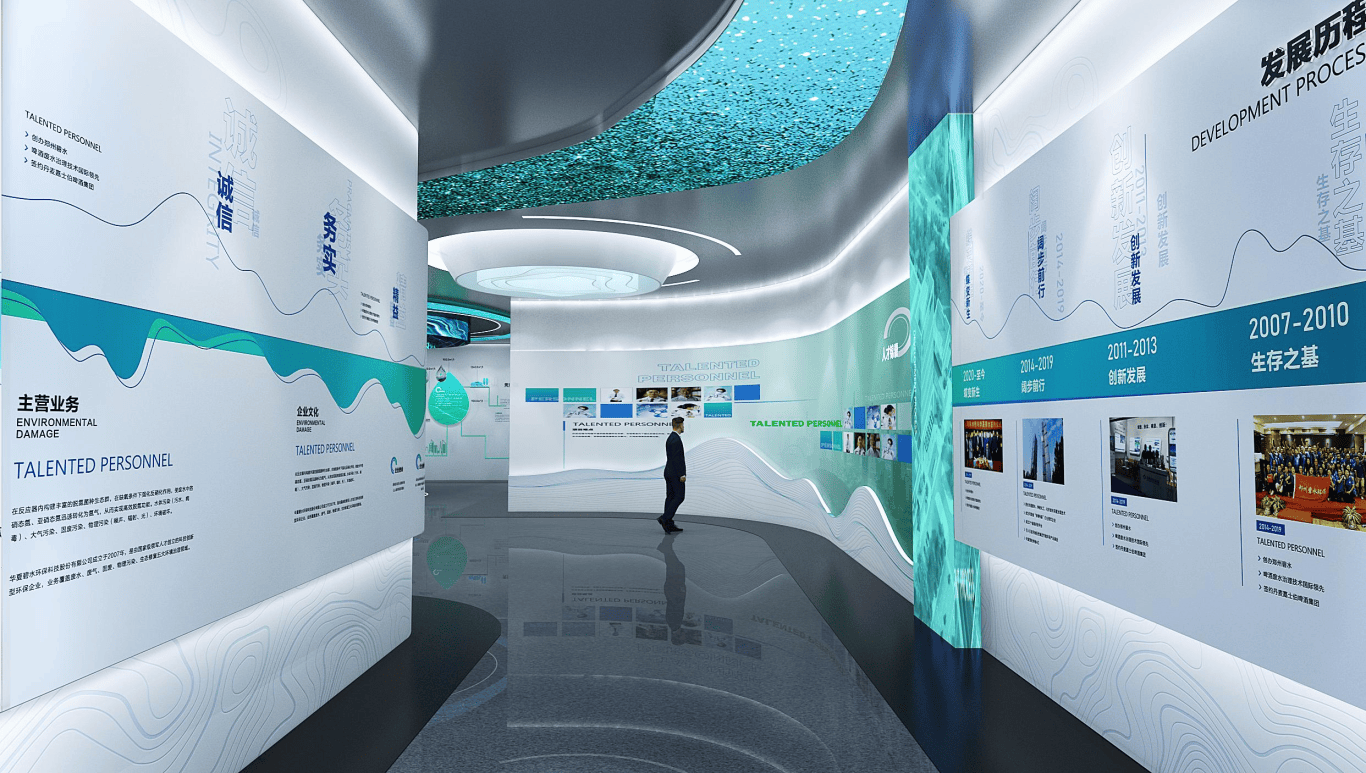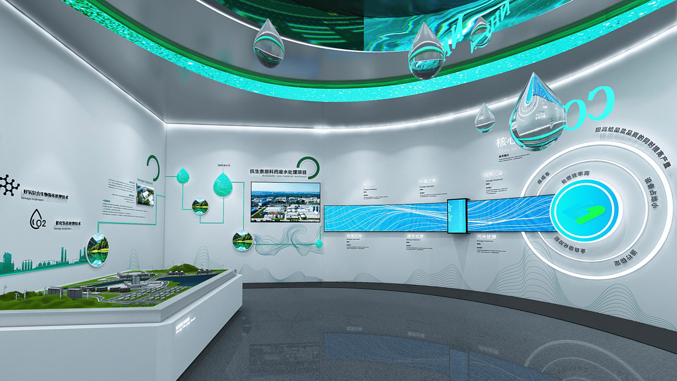 展厅总面积 510㎡,以 “流水由蓝至绿” 为视觉线索,贯穿整个空间,让展厅成为 “不竭净化的轮回场”,曲不雅呈现环保管理的全过程。