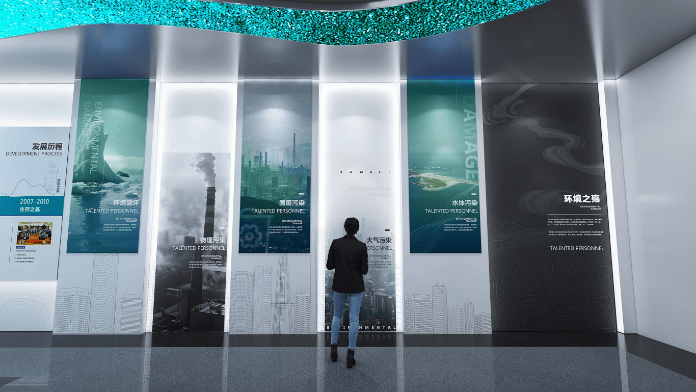20㎡的走廊区域做为展区过渡,延续 “流水由蓝至绿” 的视觉线索,搭配环保从题取项目缩略图,让参不雅者正在挪动中持续感触感染 “逐绿而行” 的从题空气,实现分歧展区的天然跟尾。