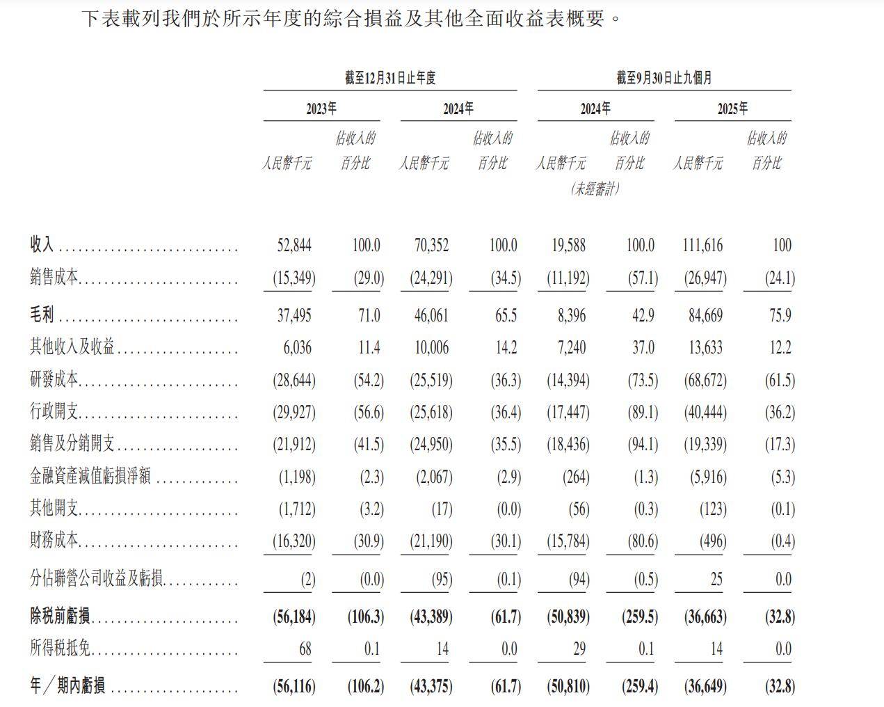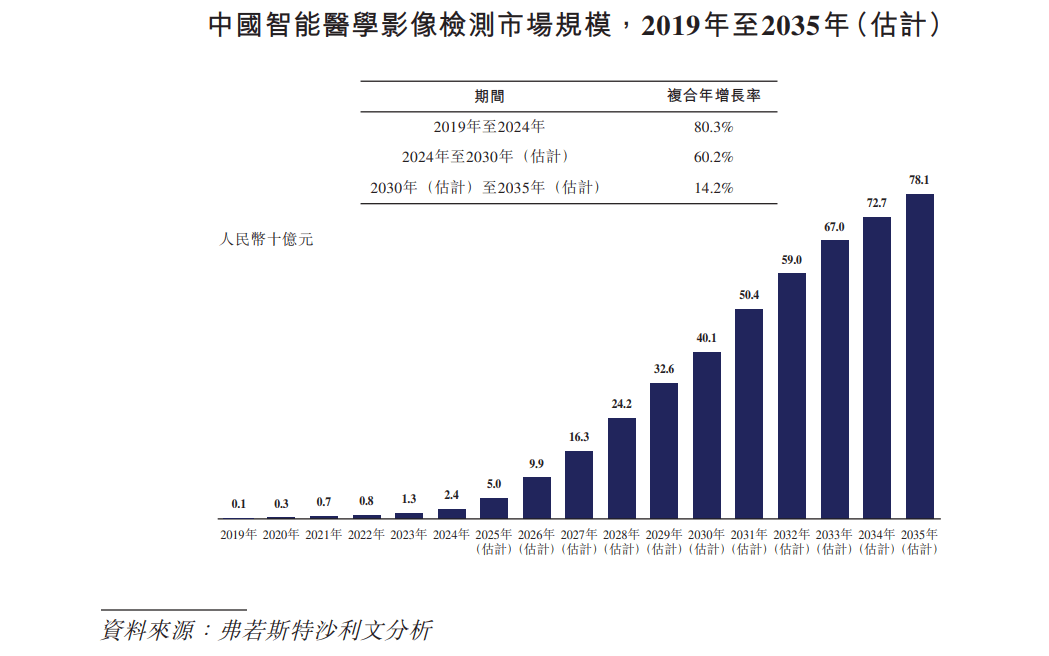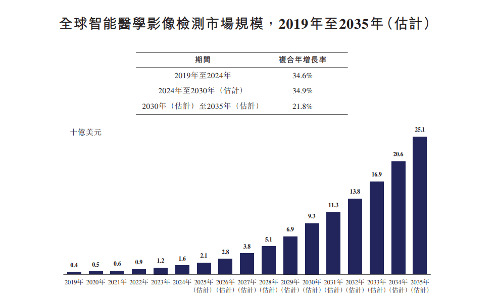 于2023年度、2024年度以及2025年截至9月30日止九个月,公司实现收入别离约为人平易近币5284。4万元、7035。2万元、11161。6万元。于2023年度、2024年度以及2025年截至9月30日止九个月,公司录得年/期内吃亏别离为5611。6万元、4337。5万元、3664。9万元。于2023年度、2024年度以及2025年截至9月30日止九个月,公司录得毛利别离为3749。5万元、4606。1万元、8466。9万元。智能医学影像检测是指操纵计较器及深度进修手艺,对医学影像进行从动识别、定量阐发,为临床供给辅帮诊断。智能医学影像检测市场的市场规模方面,按照弗若斯特沙利文的材料,全球市场由2019年的4亿美元增至2024年的16亿美元,复合年增加率为34。6%。预期将于2030年达93亿美元,并于2035年达251亿美元,各期间的复合年增加率别离为34。9%及21。8%。