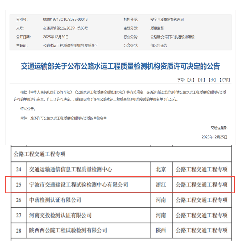 近日,交通运输部发布《公水运工程质量检测机构天分许可决定通知布告》,宁波市交通扶植工程试验检测核心无限公司申报的“公工程交通工程专项”检测天分成功获批。此举标记着全面集齐“公水运工程质量检测机构”全类别5项最高档级天分,成功跻身全国第九家、浙江省内首家全类别天分检测机构行列。